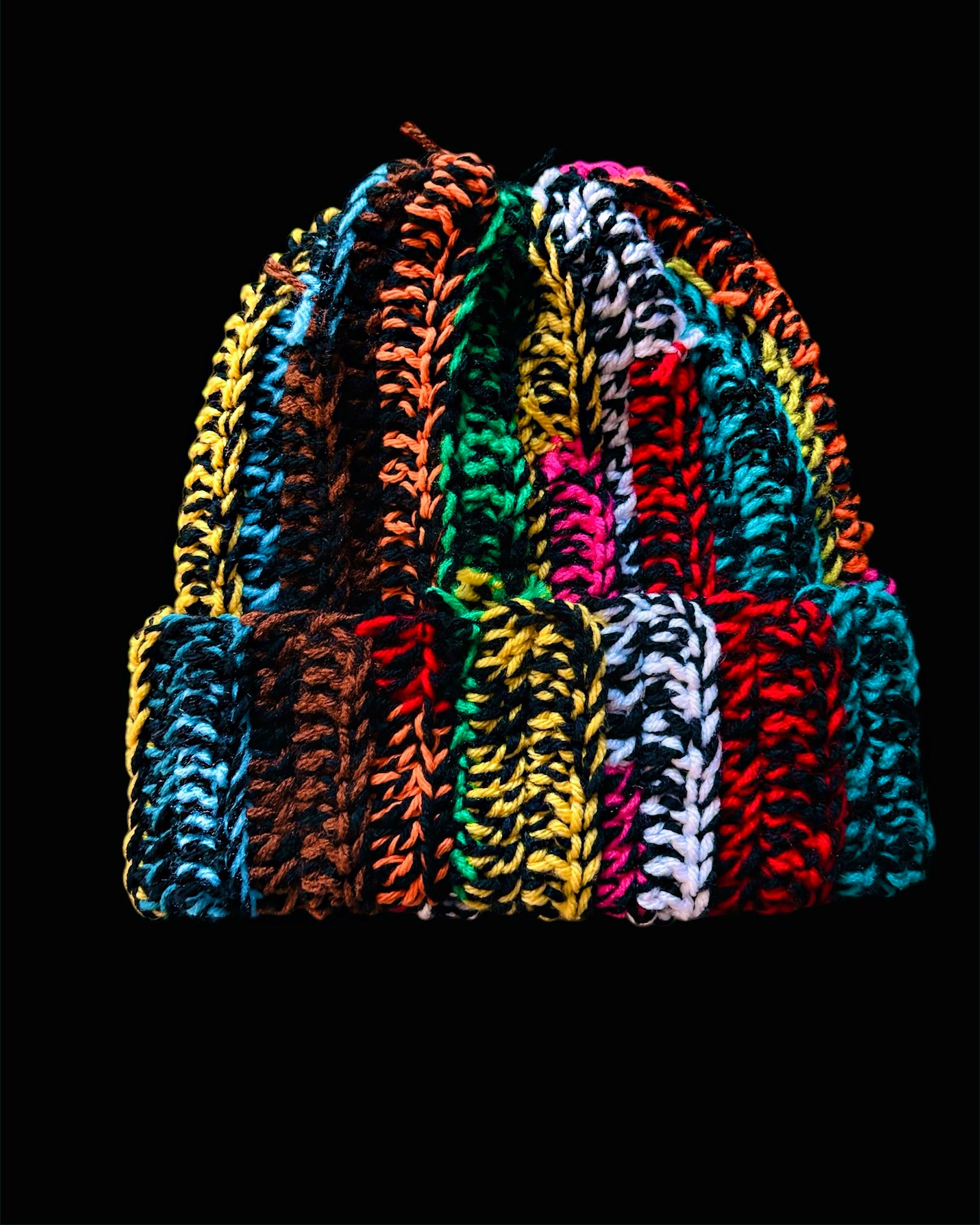 This reversible beanie features a black base with a pop of color from various acrylic scrap yarns. Each beanie is handmade, making it a truly unique accessory.